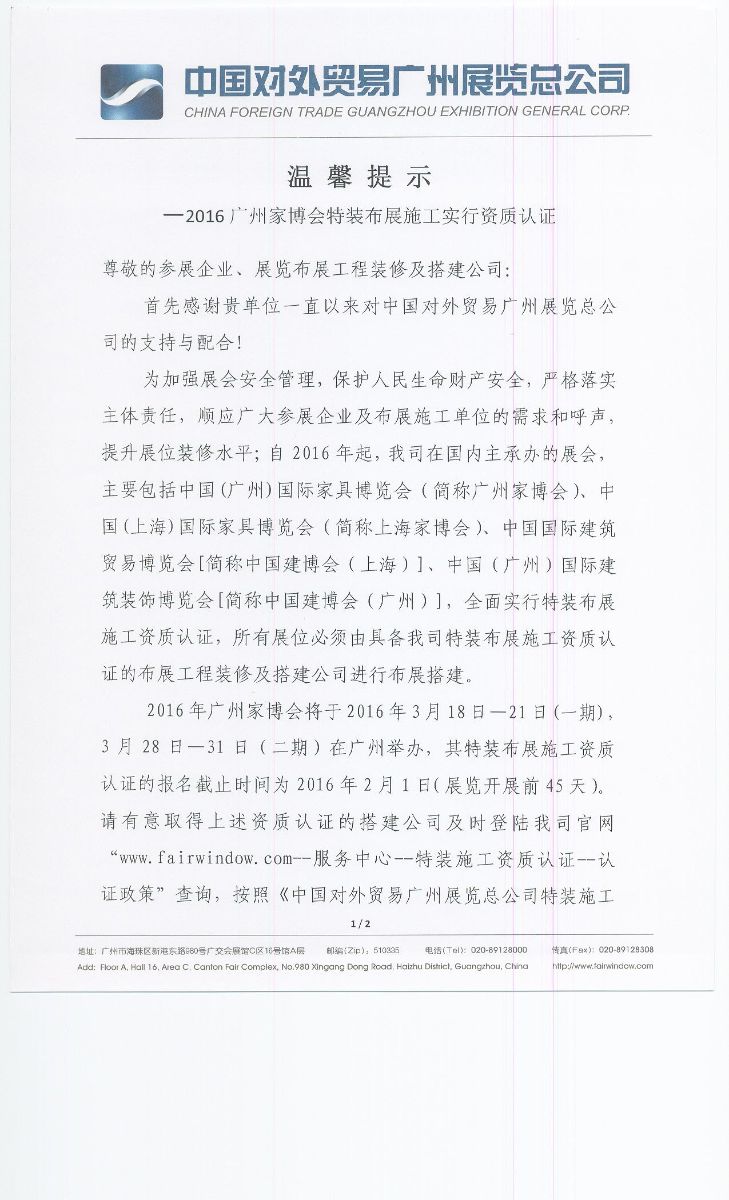 溫馨提醒--廣州家博會特征布展施工實行資質(zhì)認(rèn)證