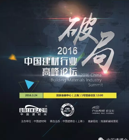 2016中國建材行業(yè)高峰論壇將于2016年3月24日在國家會展中心(上海)舉辦,本次會議由中國建材網和中國建博會聯合舉辦,克洛斯威硅藻泥獨家冠名。借助中國建博會(上海)提供的“大定制”平臺,中國建材網旨在整合現有資源的基礎上,與中國建博會合力打造一場有內涵有干貨的饕餮盛宴,為建材行業(yè)帶來不同角度的思維與觀點。