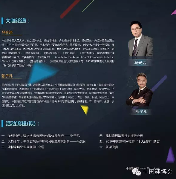 本次活動邀請獨立經濟學家、民建中央經濟委員會副主任、中央電視臺財經頻道評論員馬光遠先生,解讀中國宏觀經濟與建材家居行業(yè)的背后關聯,把脈未來建材家居產業(yè)趨勢;曾為微軟(中國)、奔馳、搜狐、網易、阿里巴巴、中國移動、中國電信等近千家國際國內知名企業(yè)提供培訓與咨詢服務的資深創(chuàng)業(yè)型實戰(zhàn)派講師、營銷團隊管理專家張子凡先生,將剖析建材企業(yè)終端零售與分銷體系,為企業(yè)在新常態(tài)發(fā)展下謀出路謀發(fā)展。建材家居企業(yè)互聯網+之道,移動+O2O思維,思想碰撞,將會擦出怎樣的火花?讓我們拭目以待!