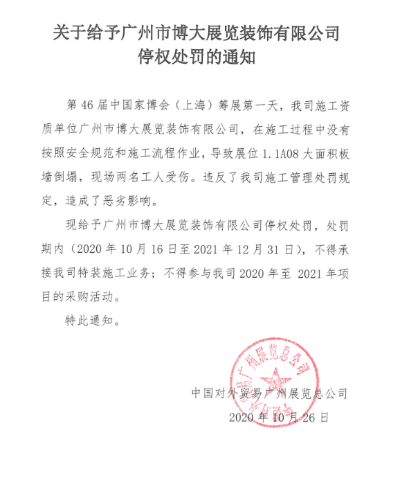 關(guān)于給予廣州市博大展覽裝飾有限公司停權(quán)處罰的通知